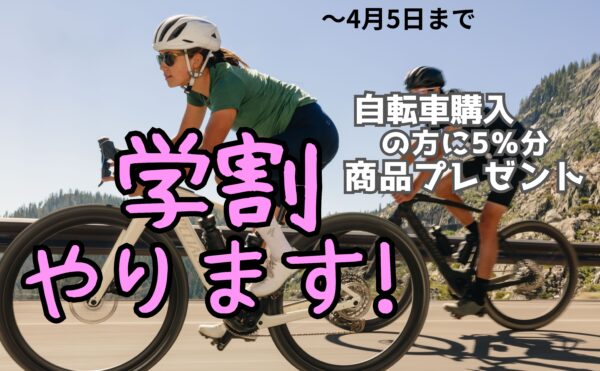 春限定 学割やります! 本日より〜4月5日まで 学生時代に通った自転車店や先輩などから支援をして頂けたことで、自転車を楽しんでこれました。今度は私が学生を応援いたします。期間中に自転車をお買い上げいただくと、車体価格の5 […]